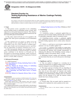 ASTM D5479-94(2020) is an internationally recognized standard practice developed by ASTM International for testing the biofouling resistance of marine coatings subjected to partial immersion in real-world marine environments. This standard offers a systematic procedure to evaluate and screen the effectiveness of biofouling resistant coatings and antifouling systems, which are essential for preventing the settlement and attachment of marine organisms on vessels, structures, and submerged equipment.