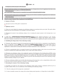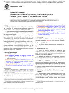 SIGNIFICANCE AND USE 5.1 There are several methods for managing non-conforming coatings in an operating nuclear power plant. This guide outlines methods that have been determined to be acceptable to the nuclear industry. 5.2 Managing the amount of non-conforming coatings is key to ensuring the amount assumed, in the licensing bases is not exceeded. 5.3 EPRI Report 1019157 provides additional information on the selection, application, inspection and maintenance of nuclear plant safety-related protective coatings. This reference offers a detailed discussion of important considerations related to protective coatings and can be used to supplement this guide as deemed necessary. SCOPE 1.1 This guide provides the user with guidance on developing a program for managing non-conforming coatings in Coating Service Level I areas of a nuclear power plant. 1.2 Non-conforming coatings include degraded qualified or acceptable coatings, unqualified coatings, unknown coatings, and unacceptable coatings. 1.3 This standard does not purport to address all of the safety concerns, if any, associated with its use. It is the responsibility of the user of this standard to establish appropriate safety, health, and environmental practices and determine the applicability of regulatory limitations prior to use. 1.4 This international standard was developed in accordance with internationally recognized principles on standardization established in the Decision on Principles for the Development of International Standards, Guides and Recommendations issued by the World Trade Organization Technical Barriers to Trade (TBT) Committee.