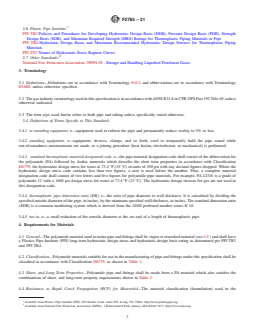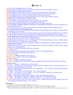 ASTM F2785-21 is a technical specification published by ASTM International. Its full title is "Standard Specification for Polyamide 12 Gas Pressure Pipe, Tubing, and Fittings". This standard covers: ABSTRACT This specification details the material and performance requirements, as well as the corresponding test methods, for the evaluation of polyamide 12 gas pressure pipes, tubing, and fittings that are intended for use in the distribution of natural gas in fuel gas mains and services for direct burial and reliner applications. It does not apply to threaded pipes. The pipes and fittings shall be made from virgin or reworked polyamide material that satisfies the short- and long-term hydrostatic design stress and hydrostatic design basis ratings, and rapid crack propagation (RCP) resistance properties. Properly sampled pipe and fitting specimens shall undergo test procedures and conform to the following requirements: workmanship; dimension (diameter, toe-in, wall thickness, wall thickness eccentricity range, ovality, and length); conditioning; slow crack growth resistance; resistance to RCP; minimum hydrostatic burst pressure/apparent tensile strength (quick burst); sustained pressure; outdoor storage stability; chemical resistance; elevated temperature service; butt fusion joints; butt heat fusion fittings; electrofusion fittings; mechanical fittings; transition fittings and anodeless risers; valves; and excess flow valves. SCOPE 1.1 This specification covers requirements and test methods for the characterization of polyamide 12 pipe, tubing, and fittings for use in fuel gas mains and services for direct burial and reliner applications. The pipe and fittings covered by this specification are intended for use in the distribution of natural gas. 1.1.1 Pipe and fittings covered by this specification shall not be joined using taper pipe threads. Butt fusion joining shall be done in accordance with Practice F3372. Design considerations are discussed in Appendix X1. In-plant quality control programs are specified in Annex A1. 1.2 The text of this specification references notes, footnotes, and appendixes which provide explanatory material. These notes and footnotes (excluding those in tables and figures) shall not be considered as requirements of the specification. 1.3 The values stated in inch-pound units are to be regarded as standard. The values given in parentheses are mathematical conversions to SI units that are provided for information only and are not considered standard. 1.4 This standard does not purport to address all of the safety concerns, if any, associated with its use. It is the responsibility of the user of this standard to establish appropriate safety, health, and environmental practices and determine the applicability of regulatory limitations prior to use. Note 1: Pipe and fittings utilizing heat fusion joining techniques produced from compounds meeting the requirements of Group 3, Class 2, and Grade 3 (PA323 or PA11) are intended for use with pipe manufactured from compounds meeting the requirements of Group 3, class 2 and Grade 3. Pipe and fittings utilizing heat fusion joining techniques produced from compounds meeting the requirements of Group 4, Class 2 and Grade 3 (PA 423 or PA12) are intended for use with pipe manufactured from compounds meeting the requirements of Group 4, Class 2 and Grade 3. As per the recommendations of the respective resin manufacturers, no cross fusion between PA 323 (PA11) and PA 423 (PA12) compounds is permitted. 1.5 This international standard was developed in accordance with internationally recognized principles on standardization established in the Decision on Principles for the Development of International Standards, Guides and Recommendations issued by the World Trade Organization Technical Barriers to Trade (TBT) Committee.