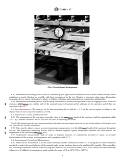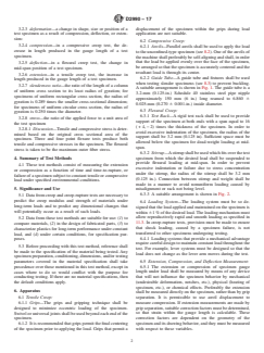SIGNIFICANCE AND USE 5.1 Data from creep and creep-rupture tests are necessary to predict the creep modulus and strength of materials under long-term loads and to predict any dimensional changes that will potentially occur as a result of such loads. 5.2 Data from these test methods are suitable for use: (1) to compare materials, (2) in the design of fabricated parts, (3) to characterize plastics for long-term performance under constant load, and (4) under certain conditions, for specification purposes. 5.3 Before proceeding with this test method, reference shall be made to the specification of the material being tested. Any specimen preparation, conditioning, dimensions, and/or testing parameters covered in the material specification shall take precedence over those mentioned in this test method, except in cases where to do so would conflict with the purpose for conducting testing. If there are no material specifications, then the default conditions apply. SCOPE 1.1 These test methods cover the determination of tensile and compressive creep and creep-rupture of plastics under specified environmental conditions (see 3.2). 1.2 In these test methods three-point loading, as described in Test Methods D790, is used for measurement of creep in flexure. However, four-point loading using the equipment and principles described in D6272 is also permitted as an option. 1.3 For measurements of creep-rupture, tension is the preferred stress mode because for some ductile plastics rupture does not occur in flexure or compression. 1.4 Test data obtained by these test methods are relevant and appropriate for use in engineering design. 1.5 The values stated in SI units are to be regarded as the standard. The values in parentheses are for information only. 1.6 This standard does not purport to address all of the safety concerns, if any, associated with its use. It is the responsibility of the user of this standard to establish appropriate safety and health practices and determine the applicability of regulatory limitations prior to use. A specific warning statement is given in 6.8.2. Note 1: This standard and ISO 899 Parts 1 and 2 address the same subject matter, but differ in technical content (and results cannot be directly compared between the two test methods). ISO 899 Part 1 addresses tensile creep and creep to rupture and ISO 899 Part 2 addresses flexural creep. Compressive creep is not addressed in ISO 899.