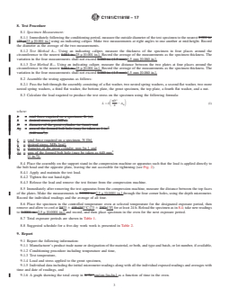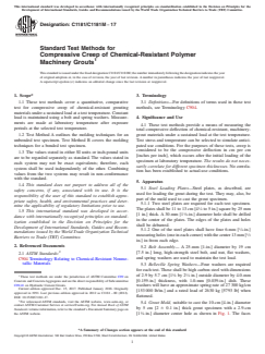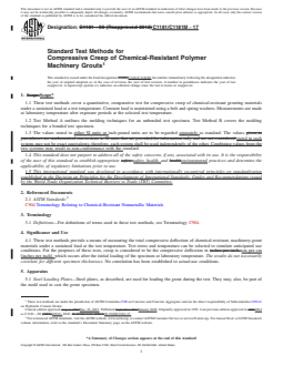 SIGNIFICANCE AND USE 4.1 These test methods provide a means of measuring the total compressive deflection of chemical-resistant, machinery-grout materials under a sustained load at the test temperature. Test stress and temperature can be selected to simulate anticipated use conditions. For the purposes of these tests, creep is considered to be the compressive deflection in cm per cm [inches per inch], which occurs after the initial loading of the specimen at laboratory temperature. The results do not necessarily correlate for different specimen thicknesses. No correlation has been established to actual-use conditions. SCOPE 1.1 These test methods cover a quantitative, comparative test for compressive creep of chemical-resistant grouting materials under a sustained load at a test temperature. Constant load is maintained using a bolt and spring washers. Measurements are made at laboratory temperature after exposure periods at the selected test temperature. 1.2 Test Method A outlines the molding techniques for an unbonded test specimen. Test Method B covers the molding techniques for a bonded test specimen. 1.3 The values stated in either SI units or inch-pound units are to be regarded separately as standard. The values stated in each system may not be exact equivalents; therefore, each system shall be used independently of the other. Combining values from the two systems may result in non-conformance with the standard. 1.4 This standard does not purport to address all of the safety concerns, if any, associated with its use. It is the responsibility of the user of this standard to establish appropriate safety, health, and environmental practices and determine the applicability of regulatory limitations prior to use. 1.5 This international standard was developed in accordance with internationally recognized principles on standardization established in the Decision on Principles for the Development of International Standards, Guides and Recommendations issued by the World Trade Organization Technical Barriers to Trade (TBT) Committee.