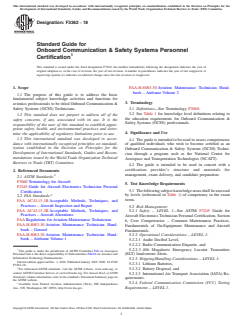 ASTM F3362-18 is a guide published by ASTM International. Its full title is "Standard Guide for Onboard Communication & Safety Systems Personnel Certification". This standard covers: SIGNIFICANCE AND USE 4.1 The guide is intended to be used to assess competencies of qualified individuals who wish to become certified as an Onboard Communication & Safety Systems (OCSS) Technician through a program such as the National Center for Aerospace and Transportation Technologies (NCATT). 4.2 The guide is intended to be used in concert with a certification provider’s structure and materials for management, exam delivery, and candidate preparation. SCOPE 1.1 The purpose of this guide is to address the basic fundamental subject knowledge activities and functions for avionics professionals to be titled Onboard Communication & Safety Systems (OCSS) Technicians. 1.2 This standard does not purport to address all of the safety concerns, if any, associated with its use. It is the responsibility of the user of this standard to establish appropriate safety, health, and environmental practices and determine the applicability of regulatory limitations prior to use. 1.3 This international standard was developed in accordance with internationally recognized principles on standardization established in the Decision on Principles for the Development of International Standards, Guides and Recommendations issued by the World Trade Organization Technical Barriers to Trade (TBT) Committee.