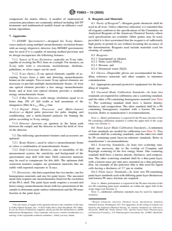 ASTM F2853-10(2023) is a standard published by ASTM International. Its full title is "Standard Test Method for Determination of Lead in Paint Layers and Similar Coatings or in Substrates and Homogenous Materials by Energy Dispersive X-Ray Fluorescence Spectrometry Using Multiple Monochromatic Excitation Beams". This standard covers: SIGNIFICANCE AND USE 5.1 This test method may be used for quantitative determinations of Pb in painted and unpainted articles such as toys, children’s products, and other consumer products. Typical test time for quantification of Pb in homogenous samples is 1 to 3 min; and typical test time for quantification of Pb in paint is 4 to 8 min. SCOPE 1.1 This test method uses energy dispersive X-ray fluorescence (EDXRF) spectrometry for detection and quantification of lead (Pb) in paint layers, similar coatings, or substrates and homogenous materials. The following material types were tested in the interlaboratory study for this standard test method: ABS plastic, polyethylene, polypropylene, PVC, glass, zinc alloy, wood, and fabric. 1.2 This technique may also be commonly referred to as High Definition X-ray Fluorescence (HDXRF) or Multiple Monochromatic Beam EDXRF (MMB-EDXRF). 1.3 This test method is applicable for the products and materials described in 1.1 for a Pb mass fraction range of 14 to 1200 mg/kg for uncoated samples and 30 to 450 mg/kg for coated samples, as specified in Table 1 and determined by an interlaboratory study using representative samples 1.4 Ensure that the analysis area of the sample is visually uniform in appearance and at least as large as the X-ray excitation beam at the point of sample excitation. 1.5 For coating analysis, this test method is limited to paint and similar coatings. Metallic coatings are not covered by this test method. 1.6 X-ray Nomenclature—This standard names X-ray lines using the IUPAC convention with the Siegbahn convention in parentheses. 1.7 There are no known ISO equivalent methods to this standard. 1.8 The values stated in SI units are to be regarded as standard. No other units of measurement are included in this standard. 1.9 This standard does not purport to address all of the safety concerns, if any, associated with its use. It is the responsibility of the user of this standard to establish appropriate safety, health, and environmental practices and determine the applicability of regulatory limitations prior to use. 1.10 This international standard was developed in accordance with internationally recognized principles on standardization established in the Decision on Principles for the Development of International Standards, Guides and Recommendations issued by the World Trade Organization Technical Barriers to Trade (TBT) Committee.
