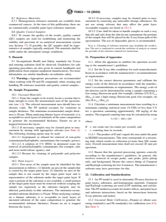 SIGNIFICANCE AND USE 5.1 This test method may be used for quantitative determinations of Pb in painted and unpainted articles such as toys, children’s products, and other consumer products. Typical test time for quantification of Pb in homogenous samples is 1 to 3 min; and typical test time for quantification of Pb in paint is 4 to 8 min. SCOPE 1.1 This test method uses energy dispersive X-ray fluorescence (EDXRF) spectrometry for detection and quantification of lead (Pb) in paint layers, similar coatings, or substrates and homogenous materials. The following material types were tested in the interlaboratory study for this standard test method: ABS plastic, polyethylene, polypropylene, PVC, glass, zinc alloy, wood, and fabric. 1.2 This technique may also be commonly referred to as High Definition X-ray Fluorescence (HDXRF) or Multiple Monochromatic Beam EDXRF (MMB-EDXRF). 1.3 This test method is applicable for the products and materials described in 1.1 for a Pb mass fraction range of 14 to 1200 mg/kg for uncoated samples and 30 to 450 mg/kg for coated samples, as specified in Table 1 and determined by an interlaboratory study using representative samples 1.4 Ensure that the analysis area of the sample is visually uniform in appearance and at least as large as the X-ray excitation beam at the point of sample excitation. 1.5 For coating analysis, this test method is limited to paint and similar coatings. Metallic coatings are not covered by this test method. 1.6 X-ray Nomenclature—This standard names X-ray lines using the IUPAC convention with the Siegbahn convention in parentheses. 1.7 There are no known ISO equivalent methods to this standard. 1.8 The values stated in SI units are to be regarded as standard. No other units of measurement are included in this standard. 1.9 This standard does not purport to address all of the safety concerns, if any, associated with its use. It is the responsibility of the user of this standard to establish appropriate safety, health, and environmental practices and determine the applicability of regulatory limitations prior to use. 1.10 This international standard was developed in accordance with internationally recognized principles on standardization established in the Decision on Principles for the Development of International Standards, Guides and Recommendations issued by the World Trade Organization Technical Barriers to Trade (TBT) Committee.