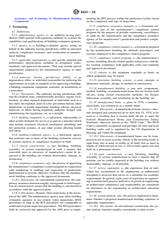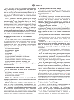ABSTRACT This specification covers agencies engaged in system analysis and compliance assurance for manufactured building. The administrative agency may utilize the services and facilities of building-evaluation agencies in carrying out its responsibilities for evaluating manufactured building systems. By providing criteria for evaluating these agencies, this standard's objective is to (1) utilize the voluntary standards system to provide a common base for the various regulatory approaches employed by the authorities having jurisdiction, and (2) make provision for varying degrees of optional technical support for the certification of manufactured building. The system analysis agency is responsible for determining whether a building system, including the design, materials, and fabrication process, is in conformance with applicable requirements. The documents of the system analysis function are: product description document, compliance assurance manual, and installation documents. The general procedures for system analysis are presented in details. The tasks of system analysis project manager, technical staff evaluating building systems, technical staff evaluating compliance assurance manuals, and project manager evaluating building systems are presented in details. The requirements and criteria for compliance assurance agencies are presented. The task of compliance assurance agency project manager, technical staff preparing compliance assurance manuals, compliance assurance supervisor of inspection, and compliance assurance inspector are presented in details. SCOPE 1.1 This specification provides the criteria for the administrative agency that has regulatory authority as granted by the authority having jurisdiction AHJ to evaluate the capabilities and qualifications of building evaluation agencies, that performs system analysis or compliance assurance or both for certification of manufactured building on behalf of an authority having jurisdiction (AHJ) that meet the needs of regulatory programs. Administrative agencies and building evaluation agencies (third-party agencies) are the primary users of the standard. 1.2 To establish an appropriate degree of intra- and inter-state credibility regarding building system evaluations made through governmental or private agencies, the authorities having jurisdiction should utilize an oversight and approval process for the building-evaluation agencies that provide the services of system analysis or compliance assurance on behalf of the AHJ that may include: approval by the AHJ for both oversight and or auditing of the regulatory body, or approval by the AHJ and oversight, and or auditing by an independent auditor for the regulatory body, or approval with the AHJ and oversight, and auditing by an independent accreditation agency. 1.3 Building-evaluation agencies examined under this specification may include governmental or private agencies or both. 1.4 Practice E651 may be used to support the evaluation of building-evaluation agencies. Other criteria such as independence, financial stability, and objectivity may need to be considered. Note 1: Practice E651 is intended as a companion standard to Specification E541 and includes questions that should be asked of system analysis and compliance assurance agencies in order for the administrative agency to evaluate their competency. 1.5 These criteria set forth the minimum personnel requirements and the technical and organizational procedures required for building-evaluation agencies engaged in evaluating manufactured building. 1.6 Criteria are included for building-evaluation agencies evaluating innovative as well as conventional building systems, against applicable requirements. 1.7 Building-evaluation agencies involved in testing, quality assurance, and evaluating building components can be evaluated by using Specification E699. 1.7.1 Specification E699 is used in conjunction with Specification E541 and P...