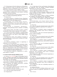ASTM E541-22 is a technical specification published by ASTM International. Its full title is "Standard Specification for Agencies Engaged in System Analysis and Compliance Assurance for Manufactured Building". This standard covers: ABSTRACT This specification covers agencies engaged in system analysis and compliance assurance for manufactured building. The administrative agency may utilize the services and facilities of building-evaluation agencies in carrying out its responsibilities for evaluating manufactured building systems. By providing criteria for evaluating these agencies, this standard's objective is to (1) utilize the voluntary standards system to provide a common base for the various regulatory approaches employed by the authorities having jurisdiction, and (2) make provision for varying degrees of optional technical support for the certification of manufactured building. The system analysis agency is responsible for determining whether a building system, including the design, materials, and fabrication process, is in conformance with applicable requirements. The documents of the system analysis function are: product description document, compliance assurance manual, and installation documents. The general procedures for system analysis are presented in details. The tasks of system analysis project manager, technical staff evaluating building systems, technical staff evaluating compliance assurance manuals, and project manager evaluating building systems are presented in details. The requirements and criteria for compliance assurance agencies are presented. The task of compliance assurance agency project manager, technical staff preparing compliance assurance manuals, compliance assurance supervisor of inspection, and compliance assurance inspector are presented in details. SCOPE 1.1 This specification provides the criteria for the administrative agency that has regulatory authority as granted by the authority having jurisdiction AHJ to evaluate the capabilities and qualifications of building evaluation agencies, that performs system analysis or compliance assurance or both for certification of manufactured building on behalf of an authority having jurisdiction (AHJ) that meet the needs of regulatory programs. Administrative agencies and building evaluation agencies (third-party agencies) are the primary users of the standard. 1.2 To establish an appropriate degree of intra- and inter-state credibility regarding building system evaluations made through governmental or private agencies, the authorities having jurisdiction should utilize an oversight and approval process for the building-evaluation agencies that provide the services of system analysis or compliance assurance on behalf of the AHJ that may include: approval by the AHJ for both oversight and or auditing of the regulatory body, or approval by the AHJ and oversight, and or auditing by an independent auditor for the regulatory body, or approval with the AHJ and oversight, and auditing by an independent accreditation agency. 1.3 Building-evaluation agencies examined under this specification may include governmental or private agencies or both. 1.4 Practice E651 may be used to support the evaluation of building-evaluation agencies. Other criteria such as independence, financial stability, and objectivity may need to be considered. Note 1: Practice E651 is intended as a companion standard to Specification E541 and includes questions that should be asked of system analysis and compliance assurance agencies in order for the administrative agency to evaluate their competency. 1.5 These criteria set forth the minimum personnel requirements and the technical and organizational procedures required for building-evaluation agencies engaged in evaluating manufactured building. 1.6 Criteria are included for building-evaluation agencies evaluating innovative as well as conventional building systems, against applicable requirements. 1.7 Building-evaluation agencies involved in testing, quality assurance, and evaluating building components can be evaluated by using Specification E699. 1.7.1 Specification E699 is used in conjunction with Specification E541 and P...