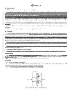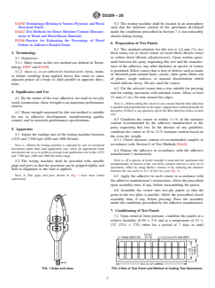 - Outlines the method for recording failure load, calculating peak shear stress, and estimating the percentage of wood failure at the bondline.