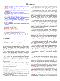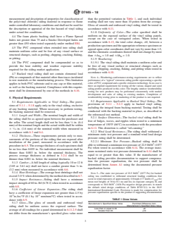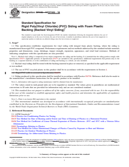 ABSTRACT This specification establishes requirements for rigid poly(vinyl chloride) siding with integral foam plastic backing. The poly(vinyl chloride) compound shall be extruded into siding and compounded so as to provide heat stability and weather exposure stability. Tests shall be performed on the vinyl siding, exclusive of any backing material, to determine compliance with length and width, thickness, camber, heat shrinkage, impact resistance, coefficient of linear expansion, gloss, color, and color uniformity requirements. The backed vinyl siding with the backing material shall also undergo testing to ascertain conformance to the following requirements: surface distortion, weatherability, windload resistance, and nail slot allowance for thermal expansion. SCOPE 1.1 This specification establishes requirements for vinyl siding with integral foam plastic backing, where the siding is manufactured from rigid PVC compound. Performance requirements and test methods addressed by this standard include materials properties and dimensions, warp, shrinkage, impact strength, expansion, appearance, and wind load resistance. Methods of indicating compliance with this specification are also provided. Note 1: Backed vinyl siding is composed of two major components: the siding and the backing. It is intended that the siding portion comply with Specification D3679. Applicable portions of Specification D3679 are included in this specification. Additional requirements that pertain only to the backing as a separate material, or to the combination of siding and backing as a whole, are also included. 1.2 Backed vinyl siding shall be tested with the backing material in place or removed, as specified in the applicable requirement or test method. 1.3 The use of PVC recycled plastic in this product shall be in accordance with the requirements in Section 4. 1.4 Siding produced to this specification shall be installed in accordance with Practice D4756. Reference shall also be made to the manufacturer's installation instructions for the specific product to be installed. Note 2: Information with regard to siding maintenance shall be obtained from the manufacturer. 1.5 The values stated in inch-pound units are to be regarded as standard. The values given in parentheses are mathematical conversions to SI units that are provided for information only and are not considered standard. 1.6 This standard does not purport to address all of the safety concerns, if any, associated with its use. It is the responsibility of the user of this standard to establish appropriate safety and health practices and determine the applicability of regulatory limitations prior to use. Note 3: There is no known ISO equivalent to this standard. 1.7 This international standard was developed in accordance with internationally recognized principles on standardization established in the Decision on Principles for the Development of International Standards, Guides and Recommendations issued by the World Trade Organization Technical Barriers to Trade (TBT) Committee.
