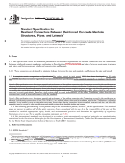 1.1 This specification covers the minimum performance and material requirements for resilient connectors used for connections between reinforced concrete manholes conforming to Specification C478/C478M and pipes, between wastewater structures and pipes, and between precast reinforced concrete pipe and laterals.
