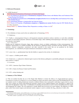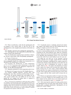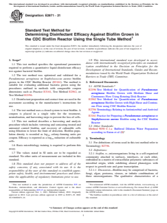 ASTM E2871-21 is a standard published by ASTM International. Its full title is "Standard Test Method for Determining Disinfectant Efficacy Against Biofilm Grown in the CDC Biofilm Reactor Using the Single Tube Method". This standard covers: SIGNIFICANCE AND USE 5.1 The Single Tube Method is designed to evaluate the efficacy of disinfectants against biofilm grown in the CDC biofilm reactor following the procedures outlined in Practice E3161. Biofilm grown in the CDC reactor is representative of biofilm that forms under high fluid shear on surfaces conducive to biofilm formation. 5.1.1 Vegetative biofilm bacteria are phenotypically different from suspended planktonic cells of the same genotype. Biofilm growth reactors are engineered to produce biofilm with specific characteristics (2). Altering either the engineered system or operating conditions will modify those characteristics as well as the physicochemical environment. The goal in biofilm research and testing is to choose the growth reactor and operating conditions that generate the most relevant biofilm for the particular study. 5.2 The test method was designed to determine the log10 reduction in bacteria after exposure to a disinfectant in a closed system. 5.3 The test method uses 50 mL conical tubes. The conical geometry allows for disinfectant exposure to biofilm on all surfaces of the coupon. For foaming disinfectants or for disinfectants requiring a larger volume of neutralizer, 250 mL conical tubes are used which preserve the required geometry and allow for greater neutralization capacity. 5.4 Each test includes three untreated control coupons (exposed to buffered dilution water) and five treated coupons (per disinfectant/concentration/contact time combination). SCOPE 1.1 This test method specifies the operational parameters required to perform a quantitative liquid disinfectant efficacy test against bacterial biofilm. 1.2 The test method was optimized and validated for a Pseudomonas aeruginosa or Staphylococcus aureus biofilm grown in the CDC Biofilm Reactor (E3161). The method is suitable for evaluating additional bacteria grown using the procedures outlined in methods with comparable coupon dimensions such as Practice E3161, Test Method E2562, or Test Method E2196. 1.3 Disinfectant preparation and contact time are used in the assessment according to the manufacturer’s instructions for use. 1.4 The test method uses a closed system to treat biofilm. A coupon is placed in a single tube for the treatment, neutralization, and harvesting steps to prevent the loss of cells. 1.5 This test method describes a harvesting and analysis procedure which includes vortexing and sonicating treated and untreated control biofilm, and recovery of culturable cells using filtration to lower the limit of detection. Biofilm population density is recorded as log10 colony-forming units per coupon. Efficacy is reported as a log10 reduction of culturable cells. 1.6 Basic microbiology training is required to perform this assay. 1.7 The values stated in SI units are to be regarded as standard. No other units of measurement are included in this standard. 1.8 This standard does not purport to address all of the safety concerns, if any, associated with its use. It is the responsibility of the user of this standard to establish appropriate safety, health, and environmental practices and determine the applicability of regulatory limitations prior to use. 1.9 This international standard was developed in accordance with internationally recognized principles on standardization established in the Decision on Principles for the Development of International Standards, Guides and Recommendations issued by the World Trade Organization Technical Barriers to Trade (TBT) Committee.
