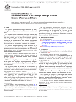 SIGNIFICANCE AND USE 5.1 This test method is a standard procedure for determining the air leakage characteristics of installed exterior windows and doors under specified static air pressure differences. Note 1: The air pressure differences acting across a building envelope vary greatly. The factors affecting air pressure differences and the implications of the resulting air leakage relative to the environment within buildings are discussed in the literature.3, 4, 5 These factors should be fully considered in specifying the test pressure differences to be used. 5.2 Rates of air leakage are sometimes used for comparison purposes. Such comparisons may not be valid unless the components being tested and compared are of essentially the same size, configuration, and design. 5.3 Rates of air leakage of essentially identical windows or doors, as determined in the laboratory (Test Method E283) and as measured in the field by this test method, have sometimes been used for comparison purposes. The correlation between the laboratory and field test results, and the correlation between actual performance of in-service products and the response to these tests has not been established because of insufficient data. 5.4 Rates of air leakage, as determined by this test method may be affected by: the age or physical condition of the test specimen; the type or quality of installation; the care exercised in the attachment of the test apparatus and the determination of extraneous leakage; and the actual conditions to which the test specimen is exposed beyond those imposed by the test method, that is temperature, relative humidity, wind impingement, etc. Consideration must be given to the proper selection of test specimens, the choice of appropriate test technique (when a choice is given within this test method), and the proper use and interpretation of the results obtained from this test to minimize the effect of these conditions. 5.5 Rates of air leakage, as determined by this test method may i... SCOPE 1.1 This test method provides a field procedure for determining the air leakage rates of installed exterior windows and doors. 1.2 This test method is applicable to exterior windows and doors and is intended to measure only such leakage associated with the assembly and not the leakage through openings between the assemblies and adjacent construction. The test method can be adapted for the latter purpose, provided the potential paths of air movement and the sources of infiltration and exfiltration can be identified, controlled, or eliminated. 1.3 This test method attempts to create and given set of natural environmental conditions. There is a strong possibility that the test method or the test apparatus may, by virtue of their design and use, induce air leakage that does not occur under natural environmental exposure. 1.4 This test method is intended for the field testing of installed exterior windows or doors. Persons interested in laboratory testing of fenestration products should reference Test Method E283. 1.5 Persons using this procedure should be knowledgeable in the area of fluid mechanics and instrumentation practices, and shall have a general understanding of fenestration products and components. 1.6 The values stated in SI units are to be regarded as standard. The values given in parentheses are mathematical conversions to inch-pound units that are provided for information only and are not considered standard. 1.7 This standard does not purport to address all of the safety concerns, if any, associated with its use. It is the responsibility of the user of this standard to establish appropriate safety, health, and environmental practices and determine the applicability of regulatory limitations prior to use. For specific precautionary statements, see Section 7. 1.8 This international standard was developed in accordance with internationally recognized principles on standardization established ...