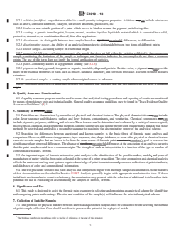 SIGNIFICANCE AND USE 6.1 This guide is designed to assist the forensic paint examiner in selecting and organizing an analytical scheme for identifying and comparing paints and coatings. The size and condition of the sample(s) will influence the selected analytical scheme. SCOPE 1.1 Forensic paint analyses and comparisons are typically distinguished by sample size that precludes the application of many standard industrial paint analysis procedures or protocols. The forensic paint examiner must address concerns such as the issues of a case or investigation, sample size, complexity and condition, environmental effects, and collection methods. These factors require that the forensic paint examiner choose test methods, sample preparation schemes, test sequence, and degree of sample alteration and consumption that are suitable to each specific case. 1.2 This guide is intended as an introduction to standard guides for forensic examination of paints and coatings. It is intended to assist individuals who conduct forensic paint analyses in their evaluation, selection, and application of tests that can be of value to their investigations. This guide describes methods to develop discriminatory information using an efficient and reasonable order of testing. The need for validated methods and quality assurance guidelines is also addressed. This document is not intended as a detailed methods description or rigid scheme for the analysis and comparison of paints, but as a guide to the strengths and limitations of each analytical method. The goal is to provide a consistent approach to forensic paint analysis. 1.3 This guide cannot replace knowledge, skill, or ability acquired through appropriate education, training, and experience and should be used in conjunction with sound professional judgment. 1.4 The values stated in SI units are to be regarded as standard. No other units of measurement are included in this standard. 1.5 Some of the methods discussed in this guide involve the use of dangerous chemicals, temperatures, and radiation sources. This guide does not purport to address the possible safety hazards or precautions associated with its application. This standard does not purport to address all of the safety concerns, if any, associated with its use. It is the responsibility of the user of this standard to establish appropriate safety, health, and environmental practices and determine the applicability of regulatory limitations prior to use. 1.6 This international standard was developed in accordance with internationally recognized principles on standardization established in the Decision on Principles for the Development of International Standards, Guides and Recommendations issued by the World Trade Organization Technical Barriers to Trade (TBT) Committee.
