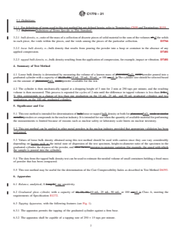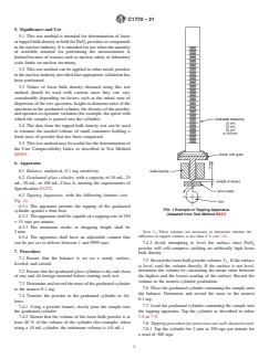 SIGNIFICANCE AND USE 5.1 This test method is intended for determination of loose or tapped bulk density or both for PuO2 powders or compounds in the nuclear industry. It is intended for use when the quantity of available material for performing the measurements is limited because of reasons such as nuclear safety or laboratory scale limits on nuclear inventory. 5.2 This test method can be applied to other metal powders in the nuclear industry provided that appropriate validation has been performed. 5.3 Values of loose bulk density obtained using this test method should be used with caution since they can vary considerably depending on factors such as the initial state of dispersion of the test specimen, height-to-diameter ratio of the specimen in the graduated cylinder, the dryness of the powder, and operator-to-operator variation (for example, the speed with which the sample is poured into the cylinder). 5.4 The data from the tapped bulk density test can be used to estimate the needed volume of small containers holding a fixed mass of powder that has been compacted. 5.5 This test method may be useful for the determination of the Carr Compressibility Index as described in Test Method D6393. SCOPE 1.1 This test method specifies a method for the determination of loose and tapped bulk density of plutonium oxide (PuO2) powder. 1.2 This test method is applicable when limited quantities of powder are available for performance of the measurements. Alternative test methods, such as Test Methods B527 or D7481, may be used when sufficient quantities are available. 1.3 This test method contains notes that are explanatory and are not part of the mandatory requirements of the method. 1.4 The values stated in SI units are to be regarded as standard. No other units of measurement are included in this standard. 1.5 This standard does not purport to address all of the safety concerns, if any, associated with its use. It is the responsibility of the user of this standard to establish appropriate safety, health, and environmental practices and determine the applicability of regulatory limitations prior to use. Some specific hazards statements are given in Section 7 on Hazards. 1.6 This international standard was developed in accordance with internationally recognized principles on standardization established in the Decision on Principles for the Development of International Standards, Guides and Recommendations issued by the World Trade Organization Technical Barriers to Trade (TBT) Committee.