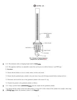 4.2 The cylinder is then mechanically tapped at a dropping height of 3 mm for 2 min at 250 taps per minute, and the resulting