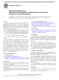 ASTM D4660-23 is a standard published by ASTM International. Its full title is "Standard Test Methods for Polyurethane Raw Materials: Determination of the Isomer Content of Toluenediisocyanate". This standard covers: SIGNIFICANCE AND USE 5.1 These test methods are suitable for research or for quality control to determine the isomer content of toluene diisocyanates. 5.2 The isomer content of a toluene diisocyanate relates to its reactivity. SCOPE 1.1 These test methods measure the amount of toluene-2,6-diisocyanate (2,6-TDI) isomer or toluene–2,4–diisocyanate (2,4-TDI) isomer in mixtures of the 2,4- and 2,6-isomers of toluenediisocyanate (TDI). Two different test methods are provided to give accurate results over the broad range of isomer concentrations possible. 1.1.1 Test Method A—Applicable to TDI samples containing 5 to 95 % of 2,6-TDI isomer (5 to 95 % 2,4-TDI isomer). 1.1.2 Test Method B—Applicable to TDI samples containing 0 to 5 % of 2,6-TDI isomer (95 to 100 % 2,4-TDI isomer). Note 1: These test methods are equivalent to ISO 15064. 1.2 The values stated in SI units are to be regarded as standard. 1.3 This standard does not purport to address all of the safety concerns, if any, associated with its use. It is the responsibility of the user of this standard to establish appropriate safety, health, and environmental practices and determine the applicability of regulatory limitations prior to use. 1.4 This international standard was developed in accordance with internationally recognized principles on standardization established in the Decision on Principles for the Development of International Standards, Guides and Recommendations issued by the World Trade Organization Technical Barriers to Trade (TBT) Committee.