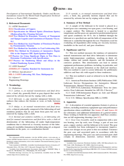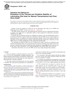 ASTM D5704-22a is a standard published by ASTM International. Its full title is "Standard Test Method for Evaluation of the Thermal and Oxidative Stability of Lubricating Oils Used for Manual Transmissions and Final Drive Axles". This standard covers: SIGNIFICANCE AND USE 5.1 This test method measures the tendency of automotive manual transmission and final drive lubricants to deteriorate under high-temperature conditions, resulting in thick oil, sludge, carbon and varnish deposits, and the formation of corrosive products. This deterioration can lead to serious equipment performance problems, including, in particular, seal failures due to deposit formation at the shaft-seal interface. This test method is used to screen lubricants for problematic additives and base oils with regard to these tendencies. 5.2 This test method is used or referred to in the following documents: 5.2.1 American Petroleum Institute (API) Publication 1560-Lubricant Service Designations for Automotive Manual Transmissions, Manual Transaxles, and Axles,7 5.2.2 STP-512A–Laboratory Performance Tests for Automotive Gear Lubricants Intended for API GL-5 Service,8 5.2.3 SAE J308-Information Report on Axle and Manual Transmission Lubricants,9 and 5.2.4 U.S. Military Specification MIL-L-2105D. SCOPE 1.1 This test method is commonly referred to as the L-60-1 test.2 It covers the oil-thickening, insolubles-formation, and deposit-formation characteristics of automotive manual transmission and final drive axle lubricating oils when subjected to high-temperature oxidizing conditions. 1.2 The values stated in inch-pound units are to be regarded as standard. The values given in parentheses are mathematical conversions to SI units that are provided for information only and are not considered standard. 1.2.1 Exceptions—The values stated in SI units for catalyst mass loss, oil mass and volume, alternator output, and air flow are to be regarded as standard. 1.2.2 SI units are provided for all parameters except where there is no direct equivalent such as the units for screw threads, or where there is a sole source supply equipment specification. 1.3 This standard does not purport to address all of the safety concerns, if any, associated with its use. It is the responsibility of the user of this standard to establish appropriate safety, health, and environmental practices and determine the applicability of regulatory limitations prior to use. Specific warning information is given in Sections 7 and 8 and Annex A7. 1.4 This international standard was developed in accordance with internationally recognized principles on standardization established in the Decision on Principles for the Development of International Standards, Guides and Recommendations issued by the World Trade Organization Technical Barriers to Trade (TBT) Committee.