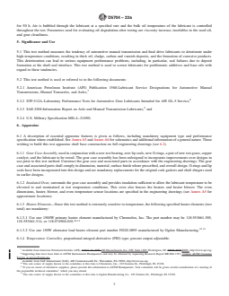SIGNIFICANCE AND USE 5.1 This test method measures the tendency of automotive manual transmission and final drive lubricants to deteriorate under high-temperature conditions, resulting in thick oil, sludge, carbon and varnish deposits, and the formation of corrosive products. This deterioration can lead to serious equipment performance problems, including, in particular, seal failures due to deposit formation at the shaft-seal interface. This test method is used to screen lubricants for problematic additives and base oils with regard to these tendencies. 5.2 This test method is used or referred to in the following documents: 5.2.1 American Petroleum Institute (API) Publication 1560-Lubricant Service Designations for Automotive Manual Transmissions, Manual Transaxles, and Axles,7 5.2.2 STP-512A–Laboratory Performance Tests for Automotive Gear Lubricants Intended for API GL-5 Service,8 5.2.3 SAE J308-Information Report on Axle and Manual Transmission Lubricants,9 and 5.2.4 U.S. Military Specification MIL-L-2105D. SCOPE 1.1 This test method is commonly referred to as the L-60-1 test.2 It covers the oil-thickening, insolubles-formation, and deposit-formation characteristics of automotive manual transmission and final drive axle lubricating oils when subjected to high-temperature oxidizing conditions. 1.2 The values stated in inch-pound units are to be regarded as standard. The values given in parentheses are mathematical conversions to SI units that are provided for information only and are not considered standard. 1.2.1 Exceptions—The values stated in SI units for catalyst mass loss, oil mass and volume, alternator output, and air flow are to be regarded as standard. 1.2.2 SI units are provided for all parameters except where there is no direct equivalent such as the units for screw threads, or where there is a sole source supply equipment specification. 1.3 This standard does not purport to address all of the safety concerns, if any, associated with its use. It is the responsibility of the user of this standard to establish appropriate safety, health, and environmental practices and determine the applicability of regulatory limitations prior to use. Specific warning information is given in Sections 7 and 8 and Annex A7. 1.4 This international standard was developed in accordance with internationally recognized principles on standardization established in the Decision on Principles for the Development of International Standards, Guides and Recommendations issued by the World Trade Organization Technical Barriers to Trade (TBT) Committee.