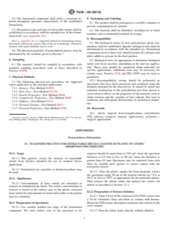 ABSTRACT This specification covers the properties for polyethylene plastics for use in medical device applications involving human tissue contact devices, short term indwellings, and fluid transfer devices. Biocompatibility tests must be conducted on the final products as the biocompatibility of these materials as a class has not been established. Plyethylene plastics should consist of basic polymers with ethylene as essentially the sole monomer. The compound may contain optional adjuvant substances required in polymer production or fabrication. The final compound should yield a consistent absorption spectrum characteristic of the established formulation. The polyethylene plastics should be tested using the specified physical test procedures for density, melt flow, tensile properties, compressive properties, stiffness, flexural fatigue, and other flexural properties. SIGNIFICANCE AND USE X1.2 Significance X1.2.1 Concentrations of trace metals are measured as extracts in simulated body fluids. The metal’s concentration in extracts is based on the surface area of the plastic extracted from which the total amount of metal deliverable to the patient may be estimated. SCOPE 1.1 This specification covers polyethylene plastics (as defined in Terminology D883) intended for use in medical device applications involving human tissue contact devices, short-term indwellings of 30 days or less, and fluid transfer devices. The biocompatibility of these materials as a class has not been established. Biocompatibility tests must be conducted on the final product. 1.2 This specification is not applicable to ultra-high molecular weight polyethylenes (UHMWPE) plastics, such as those used in joint implants, and so forth. 1.3 The values stated in SI units are to be regarded as standard. No other units of measurement are included in this standard. 1.4 This standard does not purport to address all of the safety concerns, if any, associated with its use. It is the responsibility of the user of this standard to establish appropriate safety and health practices and determine the applicability of regulatory limitations prior to use.