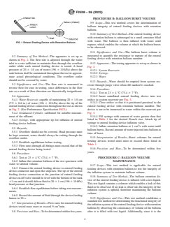 ASTM F2528-06(2023) is a standard published by ASTM International. Its full title is "Standard Test Methods for Enteral Feeding Devices with a Retention Balloon". This standard covers: ABSTRACT These test methods cover the establishment of performance requirements for the utilization of a single-use, enteral feeding device with a retention balloon, used by medical professionals for providing a means of nutrition and/or administration of medication to patients by means of natural orifice (nasal, oral, transluminal) and or a surgically created stoma. The product is manufactured in various sizes and materials such as silicone, urethane, and various polymers (as well as combinations of these) and is provided nonsterile for sterilization and sterile for single use only. The following test methods are: Flow rate through feeding lumen test method which covers the determination of flow rates through the drainage lumen of the enteral feeding device with retention balloon, balloon burst volume test method which covers the determination of balloon integrity of enteral feeding devices with retention balloon, balloon volume maintenance test method which is applicable enteral feeding devices with retention balloon to test the integrity of the inflation system to maintain balloon volume, balloon concentricity test method which is applicable enteral feeding devices with retention balloon to test the concentricy of the balloon, balloon size and shaft size test method which evaluates the retention balloon shaft size, balloon integrity test method which evaluates the integrtity of the retention balloon of the enteral feeding device, and balloon integrity in simulated gastric fluid test method which assesses the ability of the retention balloon to withstand gastric acidity levels without rupture, therefore, maintaining its functional purpose of retention. SCOPE 1.1 These test methods cover the establishment of performance requirements for the utilization of a single-use, enteral feeding device with a retention balloon, used by medical professionals for providing a means of nutrition and/or administration of medication to patients by means of natural orifice (nasal, oral, transluminal) and or a surgically created stoma. The product is manufactured in various sizes and materials such as silicone, urethane, and various polymers (as well as combinations of these) and is provided nonsterile for sterilization and sterile for single use only. Rationale for these test methods can be found in Appendix X1. 1.2 This standard does not purport to address all of the safety concerns, if any, associated with its use. It is the responsibility of the user of this standard to establish appropriate safety, health, and environmental practices and determine the applicability of regulatory limitations prior to use. 1.3 This international standard was developed in accordance with internationally recognized principles on standardization established in the Decision on Principles for the Development of International Standards, Guides and Recommendations issued by the World Trade Organization Technical Barriers to Trade (TBT) Committee.