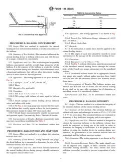 ABSTRACT These test methods cover the establishment of performance requirements for the utilization of a single-use, enteral feeding device with a retention balloon, used by medical professionals for providing a means of nutrition and/or administration of medication to patients by means of natural orifice (nasal, oral, transluminal) and or a surgically created stoma. The product is manufactured in various sizes and materials such as silicone, urethane, and various polymers (as well as combinations of these) and is provided nonsterile for sterilization and sterile for single use only. The following test methods are: Flow rate through feeding lumen test method which covers the determination of flow rates through the drainage lumen of the enteral feeding device with retention balloon, balloon burst volume test method which covers the determination of balloon integrity of enteral feeding devices with retention balloon, balloon volume maintenance test method which is applicable enteral feeding devices with retention balloon to test the integrity of the inflation system to maintain balloon volume, balloon concentricity test method which is applicable enteral feeding devices with retention balloon to test the concentricy of the balloon, balloon size and shaft size test method which evaluates the retention balloon shaft size, balloon integrity test method which evaluates the integrtity of the retention balloon of the enteral feeding device, and balloon integrity in simulated gastric fluid test method which assesses the ability of the retention balloon to withstand gastric acidity levels without rupture, therefore, maintaining its functional purpose of retention. SCOPE 1.1 These test methods cover the establishment of performance requirements for the utilization of a single-use, enteral feeding device with a retention balloon, used by medical professionals for providing a means of nutrition and/or administration of medication to patients by means of natural orifice (nasal, oral, transluminal) and or a surgically created stoma. The product is manufactured in various sizes and materials such as silicone, urethane, and various polymers (as well as combinations of these) and is provided nonsterile for sterilization and sterile for single use only. Rationale for these test methods can be found in Appendix X1. 1.2 This standard does not purport to address all of the safety concerns, if any, associated with its use. It is the responsibility of the user of this standard to establish appropriate safety, health, and environmental practices and determine the applicability of regulatory limitations prior to use. 1.3 This international standard was developed in accordance with internationally recognized principles on standardization established in the Decision on Principles for the Development of International Standards, Guides and Recommendations issued by the World Trade Organization Technical Barriers to Trade (TBT) Committee.