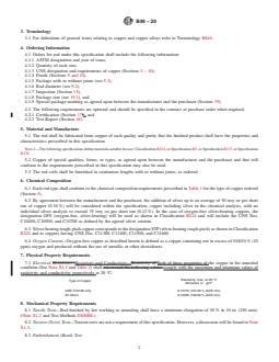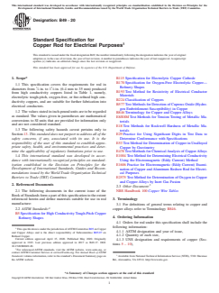 ASTM B49-20 is a technical specification published by ASTM International. Its full title is "Standard Specification for Copper Rod for Electrical Purposes". This standard covers: ABSTRACT This specification covers the requirements for rod drawing stock produced from electrolytic tough-pitch or oxygen-free coppers and is suitable for further fabrication into electrical conductors. The rod shall be fabricated from copper of such quality and purity. Copper of special qualities, forms, or types, as agreed upon between the manufacturer and the purchaser and that will conform to the requirements prescribed in this specification may also be used. The specimen shall have the following chemical composition: tellurium, selenium, bismuth, antimony, arsenic, tin, lead, iron, nickel, sulfur, silver, oxygen, cadmium, phosphorus, zinc, and manganese. Embrittlement test shall be performed on the specimen to reflect propensity towards hydrogen embrittlement and shall be performed only on oxygen-free copper. The rod shall be free of defects, but blemishes of a nature that do not interfere with the intended application are acceptable. SCOPE 1.1 This specification covers the requirements for rod in diameters from 1/4 in. to 13/8 in. (6.4 mm to 35 mm) produced from high conductivity coppers listed in Table 1, namely, electrolytic tough-pitch, oxygen-free, or fire-refined high conductivity coppers, and are suitable for further fabrication into electrical conductors. 1.2 The values stated in inch-pound units are to be regarded as standard. The values given in parentheses are mathematical conversions to SI units that are provided for information only and are not considered standard. 1.3 The following safety hazards caveat pertains only to Section 13. This standard does not purport to address all of the safety concerns, if any, associated with its use. It is the responsibility of the user of this standard to establish appropriate safety, health, and environmental practices and determine the applicability of regulatory limitations prior to use. 1.4 This international standard was developed in accordance with internationally recognized principles on standardization established in the Decision on Principles for the Development of International Standards, Guides and Recommendations issued by the World Trade Organization Technical Barriers to Trade (TBT) Committee.