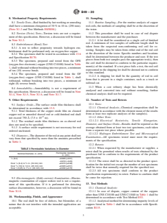 ABSTRACT This specification covers the requirements for rod drawing stock produced from electrolytic tough-pitch or oxygen-free coppers and is suitable for further fabrication into electrical conductors. The rod shall be fabricated from copper of such quality and purity. Copper of special qualities, forms, or types, as agreed upon between the manufacturer and the purchaser and that will conform to the requirements prescribed in this specification may also be used. The specimen shall have the following chemical composition: tellurium, selenium, bismuth, antimony, arsenic, tin, lead, iron, nickel, sulfur, silver, oxygen, cadmium, phosphorus, zinc, and manganese. Embrittlement test shall be performed on the specimen to reflect propensity towards hydrogen embrittlement and shall be performed only on oxygen-free copper. The rod shall be free of defects, but blemishes of a nature that do not interfere with the intended application are acceptable. SCOPE 1.1 This specification covers the requirements for rod in diameters from 1/4 in. to 13/8 in. (6.4 mm to 35 mm) produced from high conductivity coppers listed in Table 1, namely, electrolytic tough-pitch, oxygen-free, or fire-refined high conductivity coppers, and are suitable for further fabrication into electrical conductors. 1.2 The values stated in inch-pound units are to be regarded as standard. The values given in parentheses are mathematical conversions to SI units that are provided for information only and are not considered standard. 1.3 The following safety hazards caveat pertains only to Section 13. This standard does not purport to address all of the safety concerns, if any, associated with its use. It is the responsibility of the user of this standard to establish appropriate safety, health, and environmental practices and determine the applicability of regulatory limitations prior to use. 1.4 This international standard was developed in accordance with internationally recognized principles on standardization established in the Decision on Principles for the Development of International Standards, Guides and Recommendations issued by the World Trade Organization Technical Barriers to Trade (TBT) Committee.