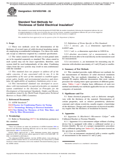SIGNIFICANCE AND USE 5.1 Some electrical properties, such as dielectric strength, vary with the thickness of the material. Determination of certain properties, such as relative permittivity (dielectric constant) and volume resistivity, usually require a knowledge of the thickness. Design and construction of electrical machinery require that the thickness of insulation be known. SCOPE 1.1 These test methods cover the determination of the thickness of several types of solid electrical insulating materials employing recommended techniques. Use these test methods except as otherwise required by a material specification. 1.2 The values stated in either SI units or inch-pound units are to be regarded separately as standard. The values stated in each system may not be exact equivalents; therefore, each system shall be used independently of the other. Combining values from the two systems may result in non-conformance with the standard. 1.3 This standard does not purport to address all of the safety concerns, if any, associated with its use. It is the responsibility of the user of this standard to establish appropriate safety, health, and environmental practices and determine the applicability of regulatory limitations prior to use. 1.4 This international standard was developed in accordance with internationally recognized principles on standardization established in the Decision on Principles for the Development of International Standards, Guides and Recommendations issued by the World Trade Organization Technical Barriers to Trade (TBT) Committee.