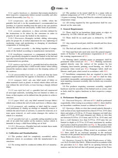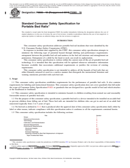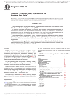 1.1 This consumer safety specification establishes requirements for the performance of portable bed rails. It also contains requirements for labeling and instructional literature. This consumer safety specification does not cover guardrails that fall under the scope of Consumer Safety Specification F1821 or guardrails that are designed for a specific model of bed and which attaches at the headboard or footboard.