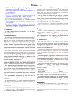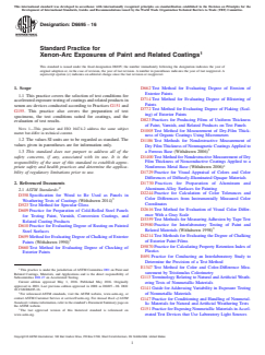 SIGNIFICANCE AND USE 4.1 The ability of a paint or coating to resist deterioration of its physical and optical properties caused by exposure to light, heat, and water can be very significant for many applications. This practice is intended to induce property changes associated with end use conditions, including the effects of daylight, moisture, and heat. The exposure used in this practice is not intended to simulate the deterioration caused by localized weather phenomena such as atmospheric pollution, biological attack, and salt water exposure. 4.2 Caution—Variation in results may be expected when different operating conditions are used. Therefore, no reference to the use of this practice shall be made unless accompanied by a report prepared according to Section 9 that describes the specific operating conditions used. Refer to Practice G151 for detailed information on the caveats applicable to use of results obtained according to this practice. Note 2: Additional information on sources of variability and on strategies for addressing variability in the design, execution and data analysis of laboratory accelerated exposure tests is found in Guide G141. 4.2.1 The spectral power distribution of light from a xenon-arc is significantly different from that produced in light and water exposure devices using carbon-arc or other light sources. The type and rate of degradation and the performance rankings produced by exposures to xenon-arcs can be much different from those produced by exposures to other types of laboratory light sources. 4.2.2 Interlaboratory comparisons are valid only when all laboratories use the same light source, filter type, and exposure conditions. 4.3 Reproducibility of test results between laboratories has been shown to be good when the stability of materials is evaluated in terms of performance ranking compared to other materials or to a control.6,7 Therefore, exposure of a similar material of known performance (a control) at the same time as the test mater... SCOPE 1.1 This practice covers the selection of test conditions for accelerated exposure testing of coatings and related products in xenon arc devices conducted according to Practices G151 and G155. This practice also covers the preparation of test specimens, the test conditions suited for coatings, and the evaluation of test results. Note 1: This practice and ISO 16474-2 address the same subject matter but differ in technical content. 1.2 The values SI units are to be regarded as standard. The values given in parentheses are for information only. 1.3 This standard does not purport to address all of the safety concerns, if any, associated with its use. It is the responsibility of the user of this standard to establish appropriate safety and health practices and determine the applicability of regulatory limitations prior to use.