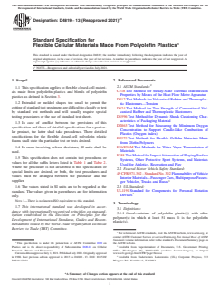 ASTM D4819-13(2021)e1 is a technical specification published by ASTM International. Its full title is "Standard Specification for Flexible Cellular Materials Made From Polyolefin Plastics". This standard covers: ABSTRACT This specification applies to flexible closed-cell materials made from polyolefin plastics and blends of polyolefin plastics. Two types of flexible, closed-cell polyolefin foams are covered: type I - closed cell foams made with polyolefin plastics and either chemically or radiation crosslinked, and type II - closed cell foams made with polyolefin plastics that are non-crosslinked. Cellular polyolefin foams furnished under this specification shall be manufactured from any resin or blend of resins that are members of the polyolefin family together with added compounding materials. Unless otherwise specified, the color of cellular polyolefin foams shall be natural. SCOPE 1.1 This specification applies to flexible closed-cell materials made from polyolefin plastics and blends of polyolefin plastics as defined in Section 3. 1.2 Extruded or molded shapes too small to permit the cutting of standard test specimens are difficult to classify or test by standard test methods and will usually require special testing procedures or the use of standard test sheets. 1.3 In case of conflict between the provisions of this specification and those of detailed specifications for a particular product, the latter shall take precedence. These detailed specifications for the flexible closed-cell polyolefin plastic foams shall state the particular test or tests desired. 1.4 In cases involving referee decisions, SI units shall be used. 1.5 This specification does not contain test procedures or values for all the suffix letters listed in Table 1 and Table 2. Where the procedure is not described in this specification or special limits are desired, or both, the test procedures and values must be arranged between the purchaser and the supplier. 1.6 The values stated in SI units are to be regarded as the standard. The values given in parentheses are for information only. Note 1: There is no known ISO equivalent to this standard. 1.7 This international standard was developed in accordance with internationally recognized principles on standardization established in the Decision on Principles for the Development of International Standards, Guides and Recommendations issued by the World Trade Organization Technical Barriers to Trade (TBT) Committee.