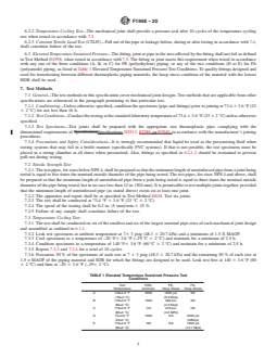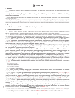 ABSTRACT This specification covers requirements and test methods for the qualification of metallic mechanical fittings for use with outside diameter controlled thermoplastic gas distribution pipe and tubing. Types of mechanical fittings: clamped insert fitting; compression fitting; compression gasket fitting; and stab-type fitting. The following tests shall be performed: tensile strength test; temperature cycling test; constant tensile load joint test; and elevated temperature sustained pressure test. SCOPE 1.1 This specification covers requirements and test methods for the qualification of metallic mechanical fittings for use with outside diameter controlled thermoplastic gas distribution pipe and tubing as specified in Specification D2513, F2785, or F2945. 1.2 The test methods described are not intended to be routine quality control tests. 1.3 This specification covers the types of mechanical fittings described in 3.3. 1.4 The values stated in inch-pound units are to be regarded as standard. The values given in parentheses are mathematical conversions to SI units that are provided for information only and are not considered standard. 1.5 The text of this standard references notes and footnotes which provide explanatory material. These notes and footnotes (excluding those in tables and figures), shall not be considered as requirements of the standard. 1.6 The following safety hazards caveat pertains only to the test method portion, Section 7, of this specification. This standard does not purport to address all of the safety concerns, if any, associated with its use. It is the responsibility of the user of this standard to establish appropriate safety, health, and environmental practices and determine the applicability of regulatory limitations prior to use. 1.7 This international standard was developed in accordance with internationally recognized principles on standardization established in the Decision on Principles for the Development of International Standards, Guides and Recommendations issued by the World Trade Organization Technical Barriers to Trade (TBT) Committee.