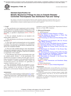 ASTM F1948-20 is a technical specification published by ASTM International. Its full title is "Standard Specification for Metallic Mechanical Fittings for Use on Outside Diameter Controlled Thermoplastic Gas Distribution Pipe and Tubing". This standard covers: ABSTRACT This specification covers requirements and test methods for the qualification of metallic mechanical fittings for use with outside diameter controlled thermoplastic gas distribution pipe and tubing. Types of mechanical fittings: clamped insert fitting; compression fitting; compression gasket fitting; and stab-type fitting. The following tests shall be performed: tensile strength test; temperature cycling test; constant tensile load joint test; and elevated temperature sustained pressure test. SCOPE 1.1 This specification covers requirements and test methods for the qualification of metallic mechanical fittings for use with outside diameter controlled thermoplastic gas distribution pipe and tubing as specified in Specification D2513, F2785, or F2945. 1.2 The test methods described are not intended to be routine quality control tests. 1.3 This specification covers the types of mechanical fittings described in 3.3. 1.4 The values stated in inch-pound units are to be regarded as standard. The values given in parentheses are mathematical conversions to SI units that are provided for information only and are not considered standard. 1.5 The text of this standard references notes and footnotes which provide explanatory material. These notes and footnotes (excluding those in tables and figures), shall not be considered as requirements of the standard. 1.6 The following safety hazards caveat pertains only to the test method portion, Section 7, of this specification. This standard does not purport to address all of the safety concerns, if any, associated with its use. It is the responsibility of the user of this standard to establish appropriate safety, health, and environmental practices and determine the applicability of regulatory limitations prior to use. 1.7 This international standard was developed in accordance with internationally recognized principles on standardization established in the Decision on Principles for the Development of International Standards, Guides and Recommendations issued by the World Trade Organization Technical Barriers to Trade (TBT) Committee.