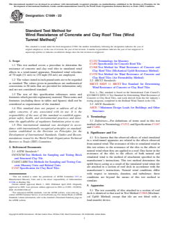 SIGNIFICANCE AND USE 4.1 It is known that the observed effects of wind simulated in a wind-tunnel apparatus are related to the effects observed from natural wind. The resistance of tiles to simulated wind in this test relates to the resistance of the tiles to the effects of natural wind when they are applied to a roof. One factor in the resistance of the tiles to the effects of both natural and simulated wind is the method of attachment specified in the manufacturer's instructions. This test method determines the uplift forces acting as a result of the simulated wind when tile are attached to a section of roof deck in accordance with the manufacturer's instructions. Natural wind conditions differ with respect to intensity, duration, and turbulence; these conditions are beyond the means of this test method to simulate. SCOPE 1.1 This test method covers a procedure to determine the resistance of concrete and clay roof tiles to simulated wind effects in a wind-tunnel apparatus. Simulated wind velocities of 70 mph (31 m/s) to 130 mph (58 m/s) are employed. 1.2 The values stated in inch-pound units are to be regarded as standard. The values given in parentheses are mathematical conversions to SI units that are provided for information only and are not considered standard. 1.3 The text of this specification references notes and footnotes which provide explanatory material. These notes and footnotes (excluding those in tables and figures) shall not be considered as requirements of the standard. 1.4 This standard does not purport to address all of the safety concerns, if any, associated with its use. It is the responsibility of the user of this standard to establish appropriate safety, health, and environmental practices and determine the applicability of regulatory limitations prior to use. 1.5 This international standard was developed in accordance with internationally recognized principles on standardization established in the Decision on Principles for the Development of International Standards, Guides and Recommendations issued by the World Trade Organization Technical Barriers to Trade (TBT) Committee.