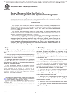 ASTM F444-88(2023) is a technical specification published by ASTM International. Its full title is "Standard Consumer Safety Specification for Scald-Preventing Devices and Systems in Bathing Areas". This standard covers: SCOPE 1.1 This consumer safety specification covers scald-preventing devices and systems delivering water in bathing areas. 1.2 This specification establishes the minimum performance requirements for the devices and systems to minimize the risks associated with the hazards of scalds. 1.3 The values stated in inch-pound units are to be regarded as standard. The values given in parentheses are mathematical conversions to SI units that are provided for information only and are not considered standard. 1.4 This international standard was developed in accordance with internationally recognized principles on standardization established in the Decision on Principles for the Development of International Standards, Guides and Recommendations issued by the World Trade Organization Technical Barriers to Trade (TBT) Committee.