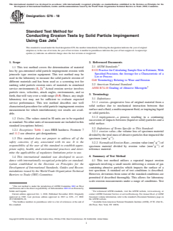 ASTM G76-18: Standard Test Method for Conducting Erosion Tests by Solid Particle Impingement Using Gas Jets is an internationally recognized standard from ASTM International. This method is designed to determine the material loss caused by solid particle impingement erosion, utilizing gas-entrained abrasive particles directed at a specimen through a jet nozzle. The procedure provides a controlled and repeatable means to evaluate and compare the erosion resistance of various materials under laboratory conditions. ASTM G76-18 is widely employed as a screening test to rank materials by their relative resistance to solid particle erosion, supporting research, development, and quality assurance efforts for materials intended for erosive service environments.