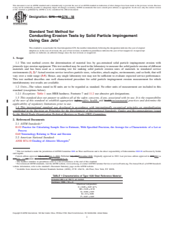 SIGNIFICANCE AND USE 5.1 The significance of this test method in any overall measurements program to assess the erosion behavior of materials will depend on many factors concerning the conditions of service applications. The users of this test method should determine the degree of correlation of the results obtained with those from field performance or results using other test systems and methods. This test method may be used to rank the erosion resistance of materials under the specified conditions of testing. SCOPE 1.1 This test method covers the determination of material loss by gas-entrained solid particle impingement erosion with jetnozzle type erosion equipment. This test method may be used in the laboratory to measure the solid particle erosion of different materials and has been used as a screening test for ranking solid particle erosion rates of materials in simulated service environments (1, 2).2 Actual erosion service involves particle sizes, velocities, attack angles, environments, and so forth, that will vary over a wide range (3-5). Hence, any single laboratory test may not be sufficient to evaluate expected service performance. This test method describes one well characterized procedure for solid particle impingement erosion measurement for which interlaboratory test results are available. 1.2 Units—The values stated in SI units are to be regarded as standard. No other units of measurement are included in this standard (exceptions below). 1.2.1 Exceptions: Table 1 uses HRB hardness. Footnote 7 and 11.2 use abrasive grit designations. 1.3 This standard does not purport to address all of the safety concerns, if any, associated with its use. It is the responsibility of the user of this standard to establish appropriate safety, health, and environmental practices and determine the applicability of regulatory limitations prior to use. 1.4 This international standard was developed in accordance with internationally recognized principles on standardization established in the Decision on Principles for the Development of International Standards, Guides and Recommendations issued by the World Trade Organization Technical Barriers to Trade (TBT) Committee.
