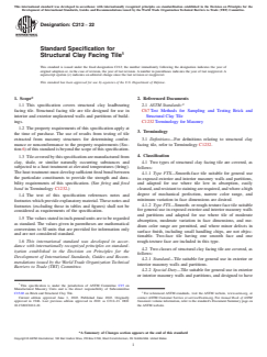 ABSTRACT This specification covers structural clay load-bearing facing tile. Structural facing tile are tile designed for use in interior and exterior unplastered walls and partitions of buildings. Two classes of structural clay facing tile are covered: standard - tile suitable for general use in exterior or interior masonry walls and partitions, and special duty - tile suitable for general use in exterior or interior masonry walls and partitions, and designed to have superior resistance to impact and moisture transmission and to support greater lateral and compressive loads than standard tile construction. Two types of structural clay facing tile are covered: type FTX - smooth-face tile suitable for general use in exposed exterior and interior masonry walls and partitions, and type FTS - smooth- or rough texture face tile suitable for general use in exposed exterior and interior masonry walls and partitions. The tile shall conform to one of the requirements for water absorption of the type specified as prescribed. The tile shall conform to the requirements for compressive strength of the class specified as prescribed. The tile shall be of the sizes and shapes specified. Requirements as to coring shall apply to multicored tile only. The compressive strength and absorption by 1-h boiling shall be tested to meet the requirements prescribed. SCOPE 1.1 This specification covers structural clay loadbearing facing tile. Structural facing tile are tile designed for use in interior and exterior unplastered walls and partitions of buildings. 1.2 The property requirements of this specification apply at the time of purchase. The use of results from testing of tile extracted from masonry structures for determining conformance or nonconformance to the property requirements (Section 6) of this standard is beyond the scope of this specification. 1.3 Tile covered by this specification are manufactured from clay, shale, or similar naturally occurring substances and subjected to a heat treatment at elevated temperatures (firing). The heat treatment must develop sufficient fired bond between the particulate constituents to provide the strength and durability requirements of this specification. (See firing and fired bond in Terminology C1232.) 1.4 The text of this specification references notes and footnotes which provide explanatory material. These notes and footnotes (excluding those in tables and figures) shall not be considered as requirements of the specification. 1.5 The values stated in inch-pound units are to be regarded as standard. The values given in parentheses are mathematical conversions to SI units that are provided for information only and are not considered standard. 1.6 This international standard was developed in accordance with internationally recognized principles on standardization established in the Decision on Principles for the Development of International Standards, Guides and Recommendations issued by the World Trade Organization Technical Barriers to Trade (TBT) Committee.