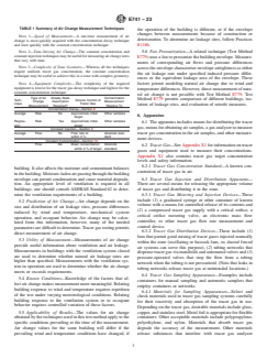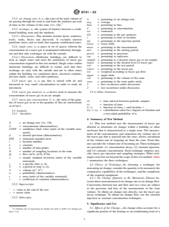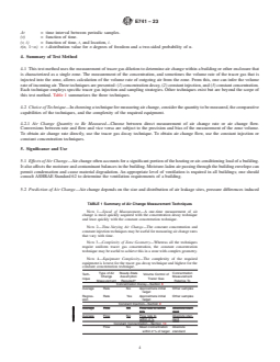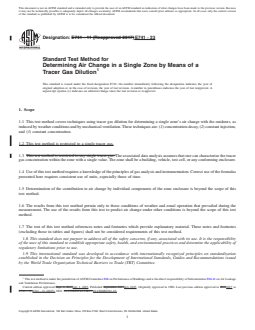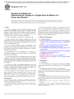 SIGNIFICANCE AND USE 5.1 Effects of Air Change—Air change often accounts for a significant portion of the heating or air-conditioning load of a building. It also affects the moisture and contaminant balances in the building. Moisture-laden air passing through the building envelope can permit condensation and cause material degradation. An appropriate level of ventilation is required in all buildings; one should consult ASHRAE Standard 62 to determine the ventilation requirements of a building. 5.2 Prediction of Air Change—Air change depends on the size and distribution of air leakage sites, pressure differences induced by wind and temperature, mechanical system operation, and occupant behavior. Air change may be calculated from this information, however, many of the needed parameters are difficult to determine. Tracer gas testing permits direct measurement of air change. 5.3 Utility of Measurement—Measurements of air change provide useful information about ventilation and air leakage. Measurements in buildings with the ventilation system closed are used to determine whether natural air leakage rates are higher than specified. Measurements with the ventilation system in operation are used to determine whether the air change meets or exceeds requirements. 5.4 Known Conditions—Knowledge of the factors that affect air change makes measurement more meaningful. Relating building response to wind and temperature requires repetition of the test under varying meteorological conditions. Relating building response to the ventilation system or to occupant behavior requires controlled variation of these factors. 5.5 Applicability of Results—The values for air change obtained by the techniques used in this test method apply to the specific conditions prevailing at the time of the measurement. Air change values for the same building will differ if the prevailing wind and temperature conditions have changed, if the operation of the building is different, or if the envelope changes between m... SCOPE 1.1 This test method covers techniques using tracer gas dilution for determining a single zone's air change with the outdoors, as induced by weather conditions and by mechanical ventilation. These techniques are: (1) concentration decay, (2) constant injection, and (3) constant concentration. 1.2 This test method is restricted to a single tracer gas. 1.3 The associated data analysis assumes that one can characterize the tracer gas concentration within the zone with a single value. The zone shall be a building, vehicle, test cell, or any conforming enclosure. 1.4 Use of this test method requires a knowledge of the principles of gas analysis and instrumentation. Correct use of the formulas presented here requires consistent use of units, especially those of time. 1.5 Determination of the contribution to air change by individual components of the zone enclosure is beyond the scope of this test method. 1.6 The results from this test method pertain only to those conditions of weather and zonal operation that prevailed during the measurement. The use of the results from this test to predict air change under other conditions is beyond the scope of this test method. 1.7 The text of this test method references notes and footnotes which provide explanatory material. These notes and footnotes (excluding those in tables and figures) shall not be considered requirements of this test method. 1.8 This standard does not purport to address all of the safety concerns, if any, associated with its use. It is the responsibility of the user of this standard to establish appropriate safety, health, and environmental practices and determine the applicability of regulatory limitations prior to use. 1.9 This international standard was developed in accordance with internationally recognized principles on standardization established in the Decision on Principles for the Development of International Standards, Guides and Reco...