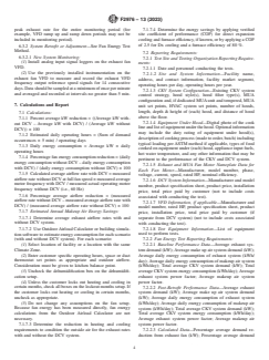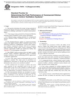 SIGNIFICANCE AND USE 5.1 Fan Energy—This standard practice determines the fan energy requirements for a constant speed and demand controlled kitchen ventilation system and estimates the savings. It can be used to compare systems' fan savings potential. 5.2 Heating and Cooling Energy—This standard practice determines the heating and cooling energy requirements for a constant speed and demand controlled kitchen ventilation system and estimates the savings. It can be used to compare systems' heating and cooling savings potential. SCOPE 1.1 This practice determines the energy savings potential of Commercial Kitchen Demand Control Ventilation (CKDCV) systems by outlining a procedure to measure system performance. 1.1.1 Fan energy savings potential of a Commercial Kitchen Demand Control Ventilation system will be determined. 1.1.2 Thermal energy savings potential of a Commercial Kitchen Demand Control Ventilation system will be determined. 1.2 This Standard Practice applies to commercial kitchen exhaust and supply demand control ventilation system in the following foodservice establishments: Casino hotel foodservice facilities, commercial cafeterias, full service restaurant, hotel foodservice facility, quick service restaurant, school cafeteria, supermarket, health care foodservice facility. See Appendix X1 for descriptions of facilities. 1.3 This CKDCV field test protocol does not apply to other demand control ventilation applications such as building heating, ventilation, and air-conditioning (HVAC) applications or laboratory applications. 1.4 Units—The values stated in inch-pound units are to be regarded as standard. The values given in parentheses are mathematical conversions to SI units that are provided for information only and are not considered standard. 1.5 This standard does not purport to address all of the safety concerns, if any, associated with its use. It is the responsibility of the user of this standard to establish appropriate safety, health, and environmental practices and determine the applicability of regulatory limitations prior to use. 1.6 This international standard was developed in accordance with internationally recognized principles on standardization established in the Decision on Principles for the Development of International Standards, Guides and Recommendations issued by the World Trade Organization Technical Barriers to Trade (TBT) Committee.