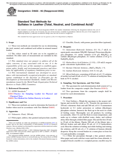 ASTM D4655-95(2023) - Standard Test Methods for Sulfates in Leather (Total, Neutral, and Combined Acid) outlines internationally recognized procedures for determining the sulfate content in mineral-tanned leather. These test methods enable laboratories and manufacturers to accurately measure the levels of total, neutral, and combined acid sulfates, providing essential data for ensuring leather quality and safety. Developed by ASTM International and approved by relevant global authorities, this standard supports the chemical analysis needs of the leather industry and related sectors.