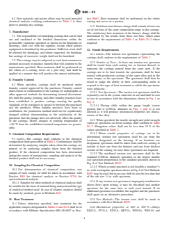 ASTM B80-23 is a technical specification published by ASTM International. Its full title is "Standard Specification for Magnesium-Alloy Sand Castings". This standard covers: ABSTRACT This specification covers magnesium-alloy sand castings. The castings shall conform to the chemical composition limits specified. The castings may be subjected to such heat treatment as deemed necessary to produce material that will conform to the requirements specified. Heat treatment shall be performed on the whole casting and never on a portion. Foundry control shall consist of examination of the castings by radiographic or other approved methods for determining internal discontinuities until the gating, pouring, and other foundry practices have been established to produce castings meeting the quality standards. The tension test specimens representing the castings shall conform to the requirements. SCOPE 1.1 This specification covers magnesium-alloy sand castings designated as shown in Table 1. 1.2 The values stated in inch-pound units are to be regarded as the standard. The SI values in parentheses are provided for information only. 1.3 This standard does not purport to address all of the safety concerns, if any, associated with its use. It is the responsibility of the user of this standard to establish appropriate safety, health, and environmental practices and determine the applicability of regulatory limitations prior to use. 1.4 This international standard was developed in accordance with internationally recognized principles on standardization established in the Decision on Principles for the Development of International Standards, Guides and Recommendations issued by the World Trade Organization Technical Barriers to Trade (TBT) Committee.