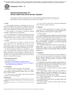 ASTM F3151-17 is a technical specification published by ASTM International. Its full title is "Standard Specification for Driven Steel Post Drive Anchor System". This standard covers: ABSTRACT This specification establishes the material requirements and installation procedures for driven steel post drive anchor systems. It provides an alternative to the use of concrete footings for the purpose of installing steel post frameworks to support chain link, expanded metal, welded wire mesh, wood, ornamental, rigid PVC, and composite fence. The drive anchor clamp bracket—the pressed steel fitting that secures the drive anchors to the post—shall be pressed steel, minimum of 11 ga. x 1 in. wide, minimum 1.2 oz/ft² hot dipped zinc coating. The bracket shall be secured using 3/8 in. diameter bolts. Industrial/commercial applications require all driven steel anchors, including round or square sections, to have equal or greater strength characteristics as the historical 1 1/2 in. x 1 1/2 in. x 1/8 in. steel angle irons. Whichever shape is chosen, the yield strength shall be 35,000 psi, maximum bending moment 6,462 lb/in., minimum 1.2 oz/ft² zinc coating, and gripping surface area 3 in.². This specification also includes post-anchoring system guidelines for commercial use. SCOPE 1.1 This standard provides an alternative to the use of concrete footings for the purpose of installing steel post framework to support chain link, expanded metal, welded wire mesh, wood, ornamental, rigid PVC, and composite fence. 1.2 This standard is not intended to include all methods available to support fence post framework. 1.3 This standard does not intend to preclude any practice that has proven equal to or given better performance under varying conditions such as location, weather, or intended use. 1.4 The values stated in inch-pound units are to be regarded as standard. 1.5 This standard does not purport to address all of the safety concerns, if any, associated with its use. It is the responsibility of the user of this standard to establish appropriate safety, health, and environmental practices and determine the applicability of regulatory limitations prior to use. 1.6 This international standard was developed in accordance with internationally recognized principles on standardization established in the Decision on Principles for the Development of International Standards, Guides and Recommendations issued by the World Trade Organization Technical Barriers to Trade (TBT) Committee.
