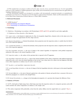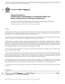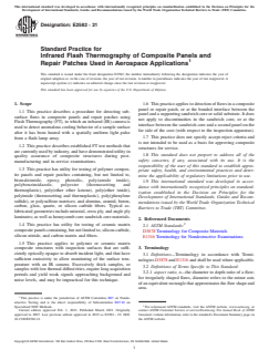 Keywords: ASTM E2582-21, infrared flash thermography, nondestructive testing, composite panels, repair patches, aerospace composites, flaw detection, IR camera, delamination, voids, inclusions, composite quality assurance, signal processing, surface emissivity, polymer matrix composites, ceramic matrix composites.