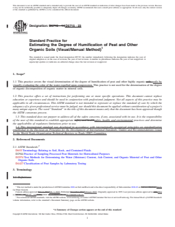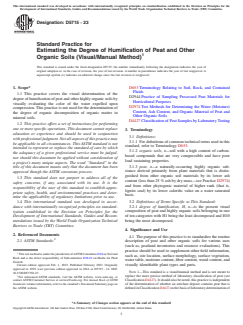 SIGNIFICANCE AND USE 4.1 The purpose of this practice is to standardize the routine description of peat and other organic soils for various uses (such as, peatland inventories and resource evaluations). This practice should be used to supplement other field information, such as, site location, surface morphology, surface vegetation, water table, moisture content, fiber content, wood content, and visually identifiable plant types and parts. Note 1: This standard is a visual/manual method and is not meant to replace the more precise method of laboratory classification of peat (see Classification D4427). It should also be noted, this practice is independent of the determination of whether an articluar deposit contains peat that is defined in Classification D4427 on the basis of laboratory determination of ash content (see Test Method D2974). SCOPE 1.1 This practice covers the visual determination of the degree of humification of peat and other highly organic soils by visually evaluating the color of the water expelled upon compression. This practice is not used for the determination of the degree of organic decomposition of organic matter in mineral soils. 1.2 This practice offers a set of instructions for performing one or more specific operations. This document cannot replace education or experience and should be used in conjunction with professional judgment. Not all aspects of this practice may be applicable in all circumstances. This ASTM standard is not intended to represent or replace the standard of care by which the adequacy of a given professional service must be judged, nor should this document be applied without consideration of a project’s many unique aspects. The word “Standard” in the title of this document means only that the document has been approved though the ASTM consensus process. 1.3 This standard does not purport to address all of the safety concerns, if any, associated with its use. It is the responsibility of the user of this standard to establish appropriate safety, health, and environmental practices and determine the applicability of regulatory limitations prior to use. 1.4 This international standard was developed in accordance with internationally recognized principles on standardization established in the Decision on Principles for the Development of International Standards, Guides and Recommendations issued by the World Trade Organization Technical Barriers to Trade (TBT) Committee.