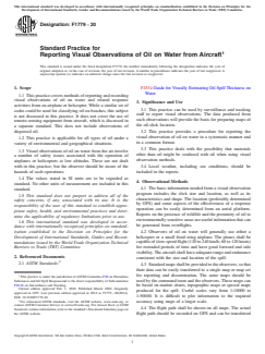 ASTM F1779-20 is a standard published by ASTM International. Its full title is "Standard Practice for Reporting Visual Observations of Oil on Water from Aircraft". This standard covers: SIGNIFICANCE AND USE 3.1 This practice can be used by surveillance and tracking staff to report visual observations. The data produced from such observations will provide the basis for preparing maps of the oil-slick location. 3.2 This practice provides a procedure for reporting the visual observation of oil on water in a systematic manner and in a common format. 3.3 This practice deals with the possibility that materials other than oil might be confused with oil when using visual observation methods. 3.4 Local weather, including sea conditions, should be included in the reports. SCOPE 1.1 This practice covers methods of reporting and recording visual observations of oil on water and related response activities from an airplane or helicopter. While a similar set of codes could be used for classifying oil on beaches, this subject is not discussed in this practice. It does not cover the use of remote-sensing equipment from aircraft, which is discussed in a separate standard. This does not include observations of dispersed oil. 1.2 This practice is applicable for all types of oil under a variety of environmental and geographical situations. 1.3 Visual observations of oil on water from the air involve a number of safety issues associated with the operation of airplanes or helicopters at low altitudes. These are not dealt with in this practice, but the observer should be aware of the hazards of such operations. 1.4 The values stated in SI units are to be regarded as standard. No other units of measurement are included in this standard. 1.5 This standard does not purport to address all of the safety concerns, if any, associated with its use. It is the responsibility of the user of this standard to establish appropriate safety, health, and environmental practices and determine the applicability of regulatory limitations prior to use. 1.6 This international standard was developed in accordance with internationally recognized principles on standardization established in the Decision on Principles for the Development of International Standards, Guides and Recommendations issued by the World Trade Organization Technical Barriers to Trade (TBT) Committee.