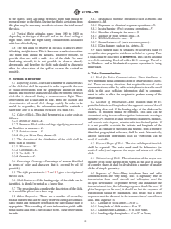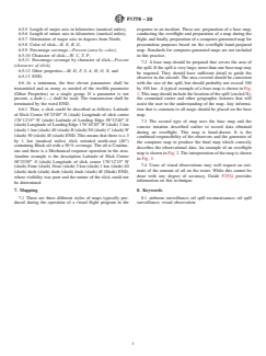SIGNIFICANCE AND USE 3.1 This practice can be used by surveillance and tracking staff to report visual observations. The data produced from such observations will provide the basis for preparing maps of the oil-slick location. 3.2 This practice provides a procedure for reporting the visual observation of oil on water in a systematic manner and in a common format. 3.3 This practice deals with the possibility that materials other than oil might be confused with oil when using visual observation methods. 3.4 Local weather, including sea conditions, should be included in the reports. SCOPE 1.1 This practice covers methods of reporting and recording visual observations of oil on water and related response activities from an airplane or helicopter. While a similar set of codes could be used for classifying oil on beaches, this subject is not discussed in this practice. It does not cover the use of remote-sensing equipment from aircraft, which is discussed in a separate standard. This does not include observations of dispersed oil. 1.2 This practice is applicable for all types of oil under a variety of environmental and geographical situations. 1.3 Visual observations of oil on water from the air involve a number of safety issues associated with the operation of airplanes or helicopters at low altitudes. These are not dealt with in this practice, but the observer should be aware of the hazards of such operations. 1.4 The values stated in SI units are to be regarded as standard. No other units of measurement are included in this standard. 1.5 This standard does not purport to address all of the safety concerns, if any, associated with its use. It is the responsibility of the user of this standard to establish appropriate safety, health, and environmental practices and determine the applicability of regulatory limitations prior to use. 1.6 This international standard was developed in accordance with internationally recognized principles on standardization established in the Decision on Principles for the Development of International Standards, Guides and Recommendations issued by the World Trade Organization Technical Barriers to Trade (TBT) Committee.