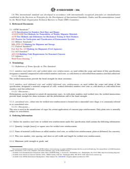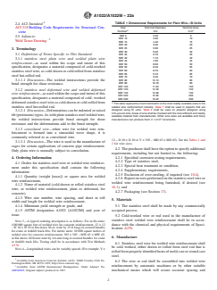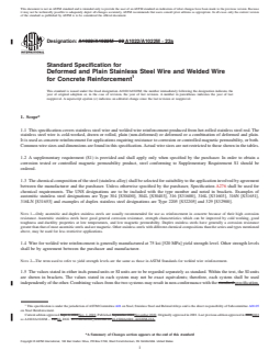ABSTRACT This specification covers stainless steel wire and welded wire reinforcements from hot-rolled stainless steel rod to be used as concrete reinforcement with corrosion resistant and magnetic permeability properties. The material shall be cold-worked, drawn or rolled, and plain or deformed. Materials shall adhere to deformation requirements. Tensile, yield, and weld shear strengths shall be measured. Bend tests shall also be performed. Dimensional requirements and permissible variations in width, length, weight, density, cross-sectional area, diameter, and average spacings of wires are specified. Guidelines for sampling, inspection, rejection, retest, certification, and packaging are given. SCOPE 1.1 This specification covers stainless steel wire and welded wire reinforcement produced from hot-rolled stainless steel rod. The stainless steel wire is cold-worked, drawn or rolled, plain (non-deformed) or deformed or a combination of deformed and plain. It is used as concrete reinforcement for applications requiring resistance to corrosion or controlled magnetic permeability, or both. Common wire sizes and dimensions are found in this specification. Actual wire sizes are not restricted to those shown in the tables. 1.2 A supplementary requirement (S1) is provided and shall apply only when specified by the purchaser. In order to obtain a corrosion tested or controlled magnetic permeability product, steel conforming to Supplementary Requirement S1 should be ordered. 1.3 The chemical composition of the steel (stainless alloy) shall be selected for suitability to the application involved by agreement between the manufacturer and the purchaser. Unless otherwise specified by the purchaser, Specification A276 shall be used for chemical requirements. The UNS designations are to be included with the type number and noted in brackets. Examples of austenitic stainless steel designations are Type 304 [S30400], 304L [S30403], 316 [S31600], 316L [S31603], 316N [S31651], 316LN [S31653] and examples of duplex stainless steel designations are Type 2205 [S32205] and 329 [S32900]. Note 1: Only austenitic and duplex stainless steels are usually recommended for use as reinforcement in concrete because of their high corrosion resistance. Austenitic stainless steels have good general corrosion resistance, strength characteristics which can be improved by cold working, good toughness and ductility properties at low temperatures, and low magnetic permeability. Duplex stainless steels have generally a corrosion resistance greater than that of most austenitic steels and are magnetic. Other stainless steels with different chemical compositions than the series and types mentioned above, may be used for less restrictive applications. 1.4 Wire for welded wire reinforcement is generally manufactured at 75 ksi [520 MPa] yield strength level. Other strength levels shall be by agreement between the purchaser and manufacturer. Note 2: The term used to refer to yield strength levels are the same as those in ASTM Standards for welded wire reinforcement. 1.5 The values stated in either inch-pound units or SI units are to be regarded separately as standard. Within the text, the SI units are shown in brackets. The values stated in each system may not be exact equivalents; therefore, each system shall be used independently of the other. Combining values from the two systems may result in non-conformance with the specification. 1.6 This international standard was developed in accordance with internationally recognized principles on standardization established in the Decision on Principles for the Development of International Standards, Guides and Recommendations issued by the World Trade Organization Technical Barriers to Trade (TBT) Committee.