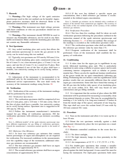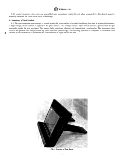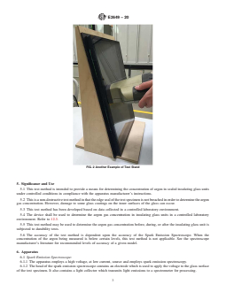 SIGNIFICANCE AND USE 5.1 This test method is intended to provide a means for determining the concentration of argon in sealed insulating glass units under controlled conditions in compliance with the apparatus manufacturer's instructions. 5.2 This is a non-destructive test method in that the edge seal of the test specimen is not breached in order to determine the argon gas concentration. However, damage to some glass coatings on the inner surfaces of the glass can occur. 5.3 This test method has been developed based on data collected in a controlled laboratory environment. 5.4 The device shall be used to determine the argon gas concentration in insulating glass units in a controlled laboratory environment. Refer to 12.3. 5.5 This test method may be used to determine the argon gas concentration before, during, or after the insulating glass unit is subjected to durability tests. 5.6 The accuracy of the test method is dependent upon the accuracy of the Spark Emission Spectroscope. When the concentration of the argon being measured is below certain levels, this test method is not applicable. See the spectroscope manufacturer’s literature for recommended levels of accuracy of a given model. SCOPE 1.1 This test method covers procedures for using a spark emission spectroscope to determine the concentration of argon gas in the space between the lites of a sealed insulating glass unit. 1.2 This is a non-destructive test method. 1.3 This test method shall be used only in a controlled laboratory environment. 1.4 This test method is applicable for insulating glass units where argon has been added to the sealed insulating glass cavity and the balance of the gas is atmospheric air. 1.5 This test method is applicable for clear, double-glazed insulating glass units. 1.6 This test method is applicable for double-glazed insulating glass units with one lite having a metallic coating or tinted glass, or both, and with clear glass as the other lite. 1.7 This test method is applicable for triple-glazed insulating glass units only when the center lite of glass has a metallic coating (either low emissivity (low E) or reflective) and both of the other lites are clear glass. 1.8 This test method also includes a procedure for verifying the accuracy of the readings of the test apparatus. 1.9 The values stated in SI units are to be regarded as standard. The values given in parentheses after SI units are provided for information only and are not considered standard. 1.10 This standard does not purport to address all of the safety concerns, if any, associated with its use. It is the responsibility of the user of this standard to establish appropriate safety, health, and environmental practices and determine the applicability of regulatory limitations prior to use. For specific warning statements, refer to Section 7 on Hazards. 1.11 This international standard was developed in accordance with internationally recognized principles on standardization established in the Decision on Principles for the Development of International Standards, Guides and Recommendations issued by the World Trade Organization Technical Barriers to Trade (TBT) Committee.
