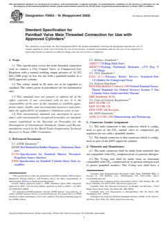 ASTM F2653-16(2020) is a technical specification published by ASTM International. Its full title is "Standard Specification for Paintball Valve Male Threaded Connection for Use with Approved Cylinders". This standard covers: SCOPE 1.1 This specification covers the male threaded connection used to connect a CO2 Control Valve or Compressed Gas Regulator with a normal working output pressure of 10 342 kPa (1800 psig) or less for use with a paintball marker to a DOT approved cylinder. 1.2 The values stated in SI units are to be regarded as standard. The values given in parentheses are for information only. 1.3 This standard does not purport to address all of the safety concerns, if any, associated with its use. It is the responsibility of the user of this standard to establish appropriate safety, health, and environmental practices and determine the applicability of regulatory limitations prior to use. 1.4 This international standard was developed in accordance with internationally recognized principles on standardization established in the Decision on Principles for the Development of International Standards, Guides and Recommendations issued by the World Trade Organization Technical Barriers to Trade (TBT) Committee.