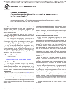 SIGNIFICANCE AND USE 3.1 This practice provides guidance for reporting, displaying, and plotting electrochemical corrosion data and includes recommendations on signs and conventions. Use of this practice will result in the reporting of electrochemical corrosion data in a standard format, facilitating comparison between data developed at different laboratories or at different times. The recommendations outlined in this standard may be utilized when recording and reporting corrosion data obtained from electrochemical tests such as potentiostatic and potentiodynamic polarization, polarization resistance, electrochemical impedance and admittance measurements, galvanic corrosion, and open circuit potential measurements. SCOPE 1.1 This practice covers conventions for reporting and displaying electrochemical corrosion data. Conventions for potential, current density, electrochemical impedance and admittance, as well as conventions for graphical presentation of such data are included. 1.2 The values stated in SI units are to be regarded as standard. No other units of measurement are included in this standard. See also 7.4. 1.3 This standard does not purport to address all of the safety concerns, if any, associated with its use. It is the responsibility of the user of this standard to establish appropriate safety, health, and environmental practices and determine the applicability of regulatory limitations prior to use. 1.4 This international standard was developed in accordance with internationally recognized principles on standardization established in the Decision on Principles for the Development of International Standards, Guides and Recommendations issued by the World Trade Organization Technical Barriers to Trade (TBT) Committee.